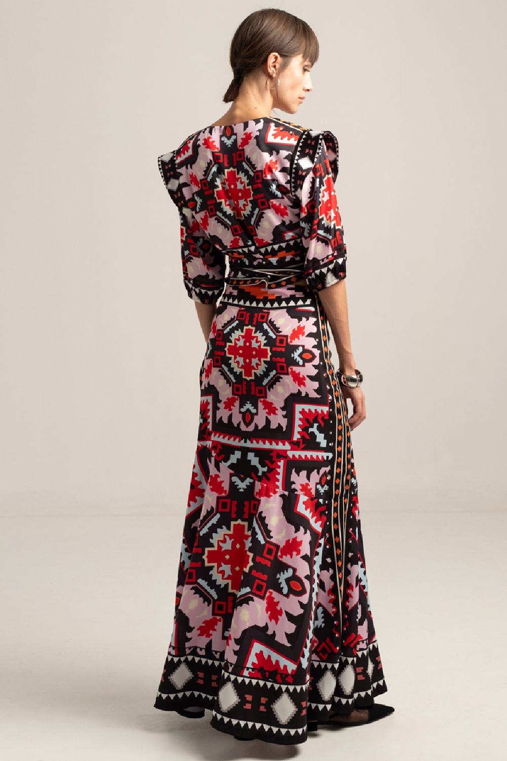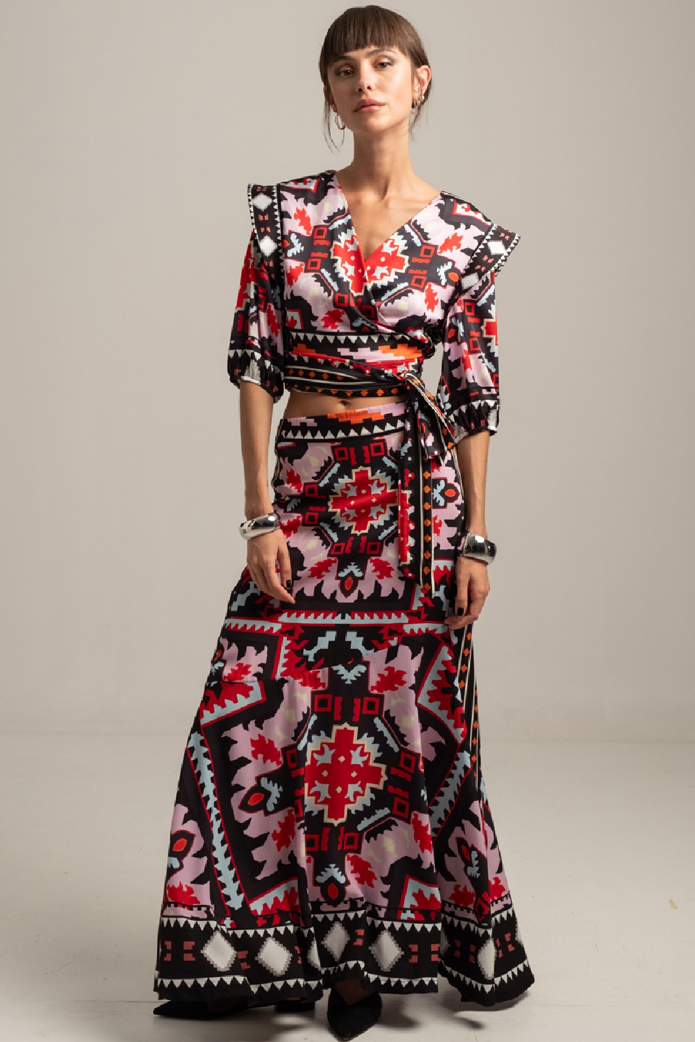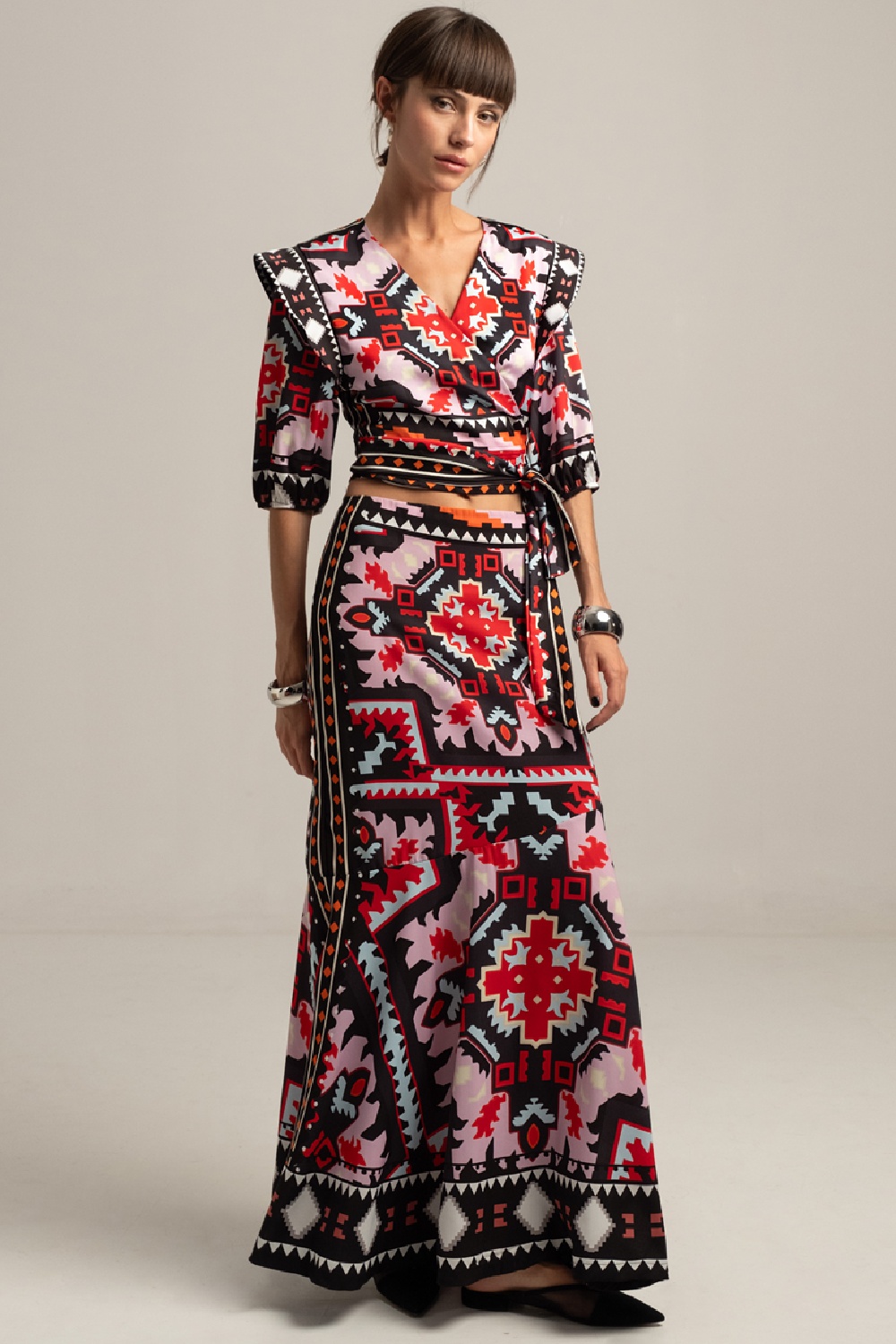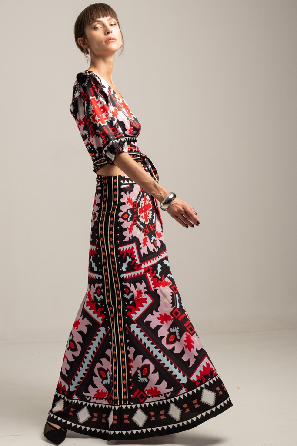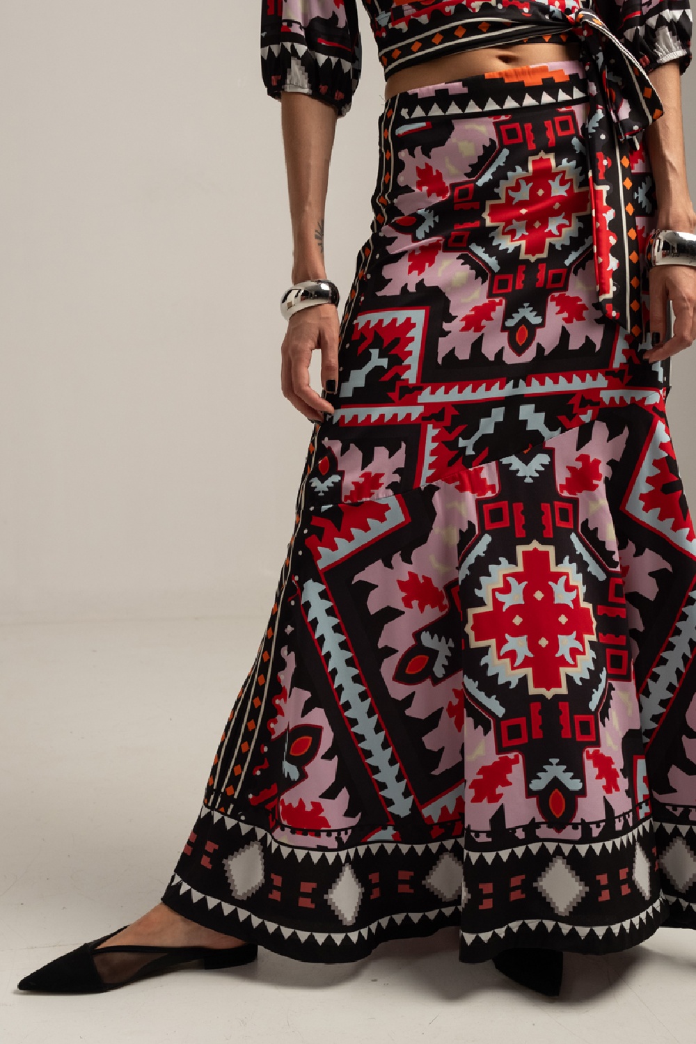 Max-out the beautiful with the Labyrinth Maxi Skirt. Featuring a long boho-style trend, the warming, earthly shades and pretty pattern are strikingly alluring. The design is super-flattering, with a fitted waist and slightly flared skirt. A must-have garment.